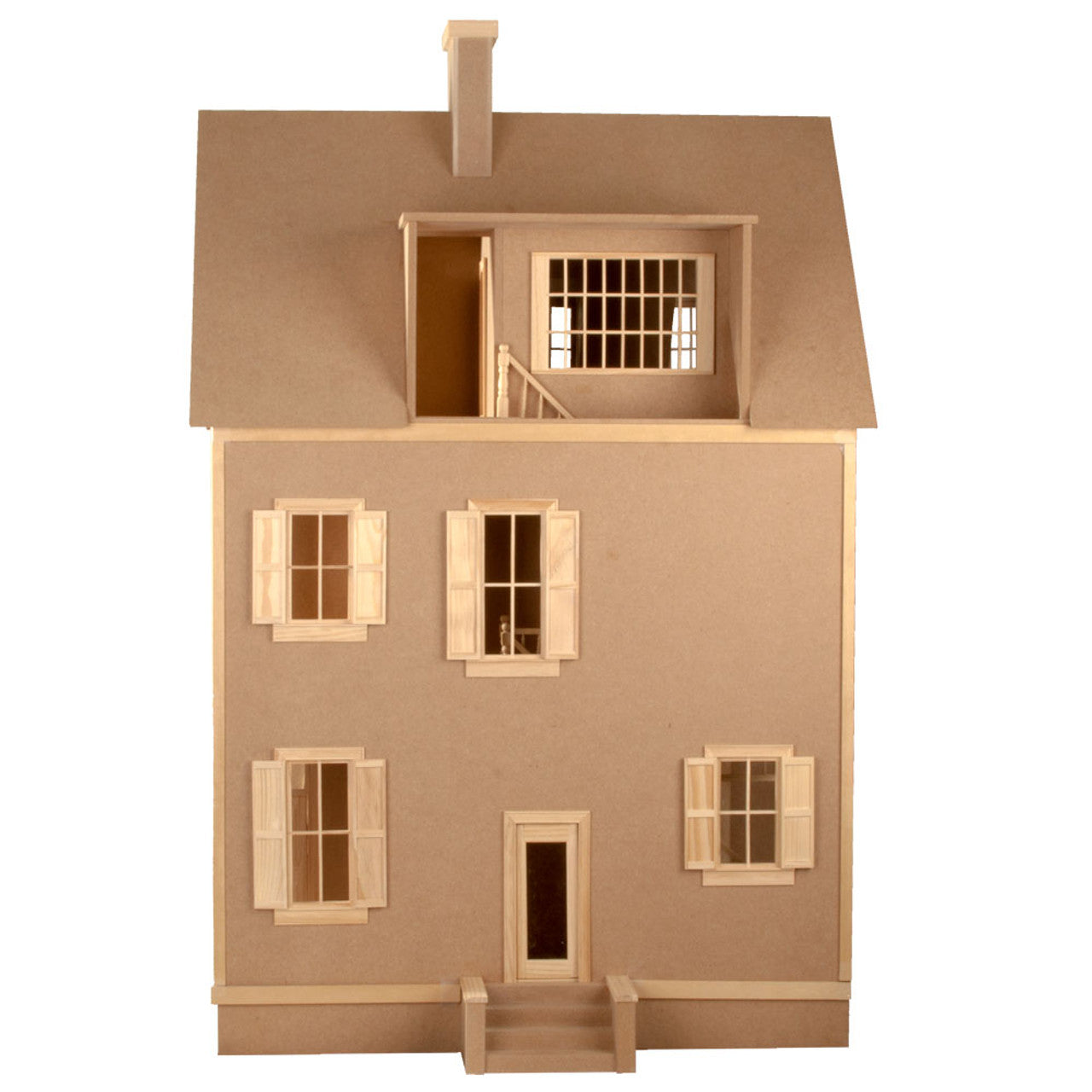 Spring Run was inspired by grand historic farmhouses yet designed for modern living. Its timeless architectural design can become traditional, modern or next in design – whatever your mini style is! This house has structural parts made of sturdy MDF; trim and detailing parts are whitewood. All windows and doors are included, as are shutters, two interior staircases, front porch steps and pergola and trim/railings.